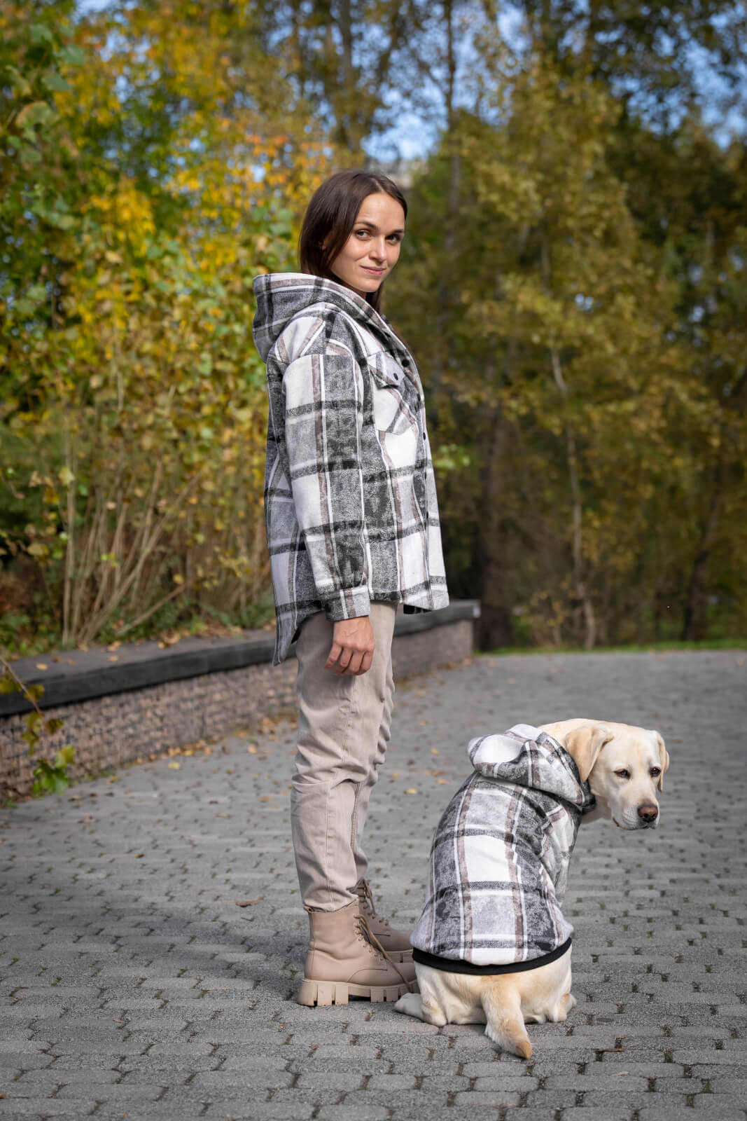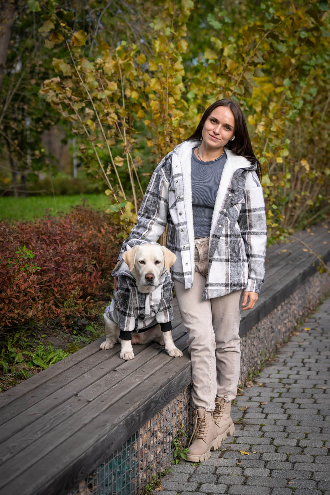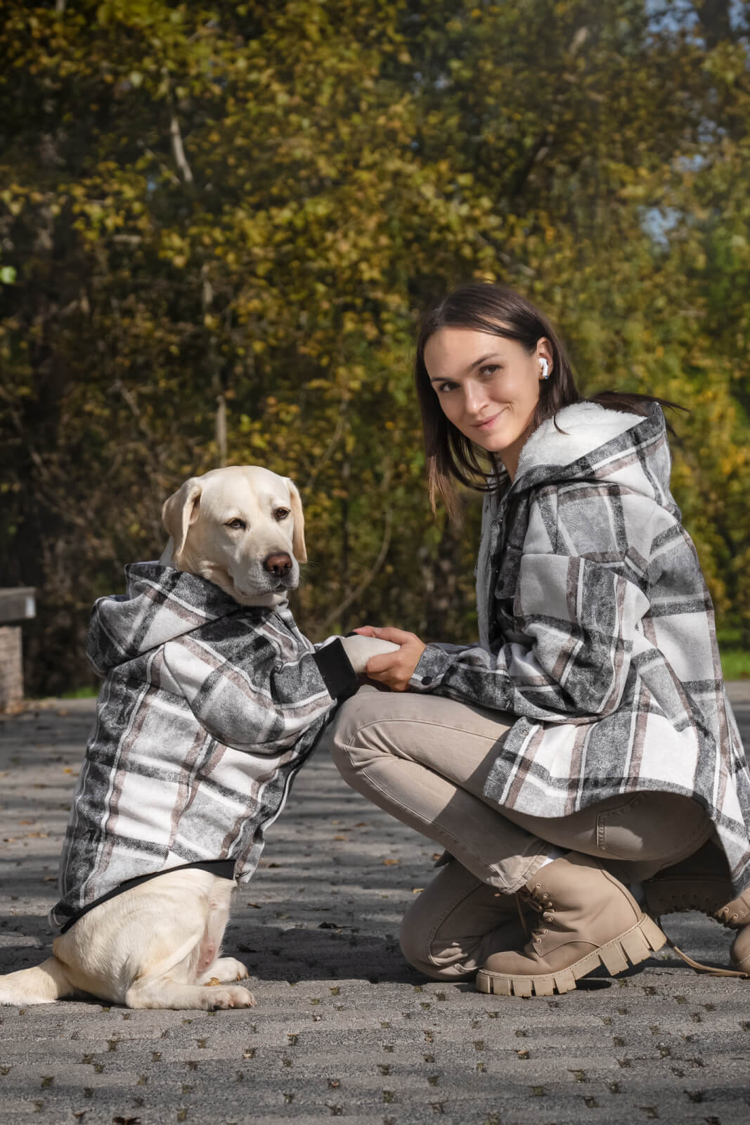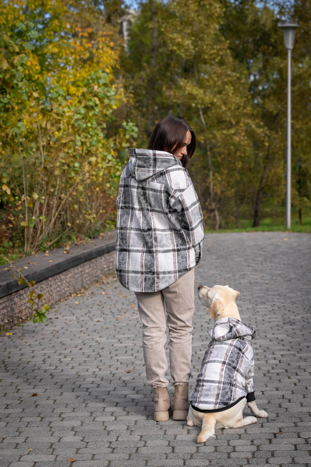 Плотная ткань в классическую клетку и мягкий меховой подклад сохраняют тепло, а одинаковые куртки для хозяина и питомца создают эффектный дуэт.