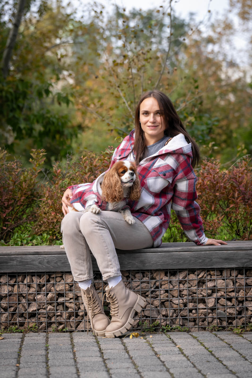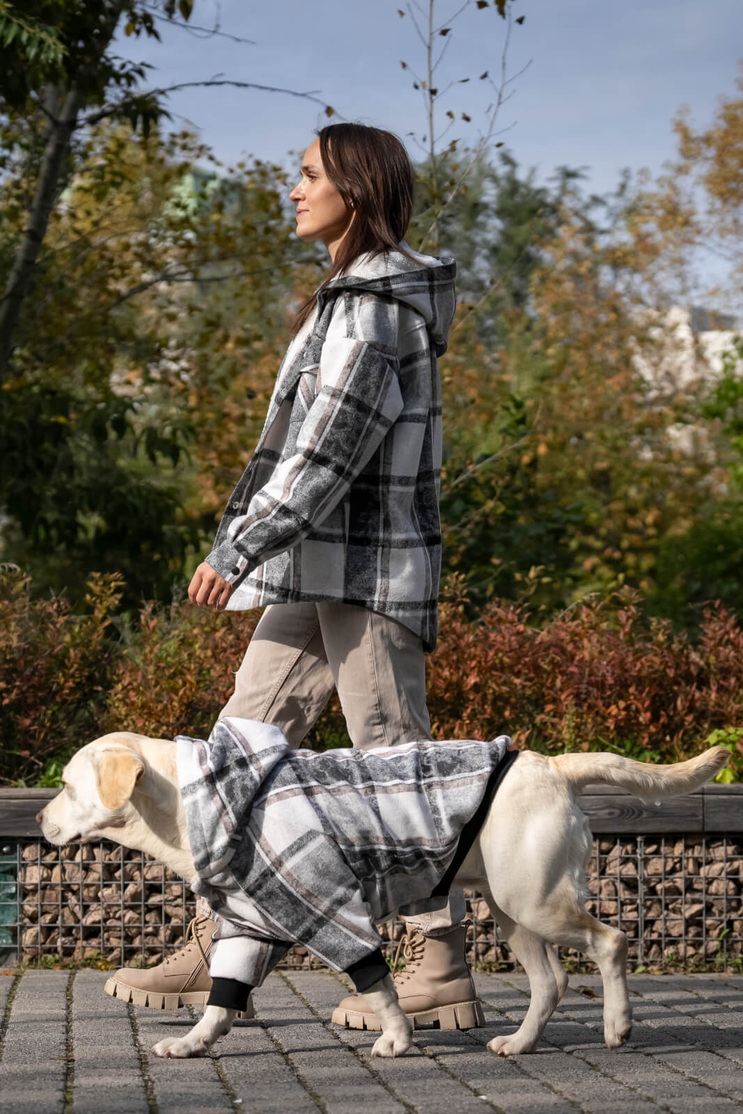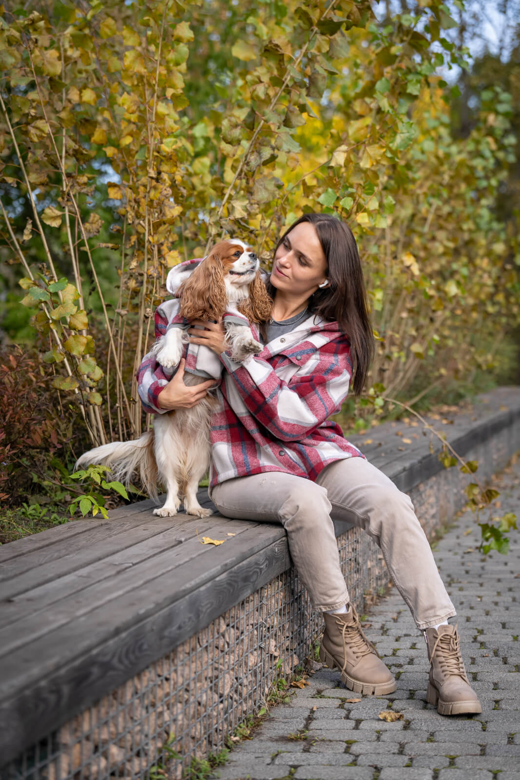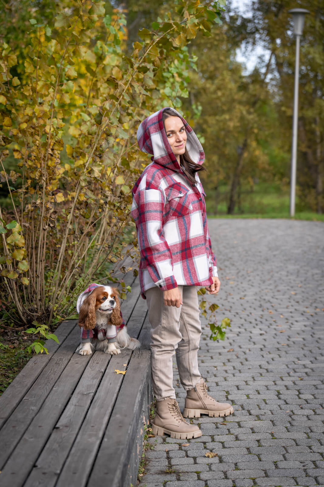 Плотная ткань в классическую клетку и мягкий меховой подклад сохраняют тепло, а одинаковые куртки для хозяина и питомца создают эффектный дуэт.