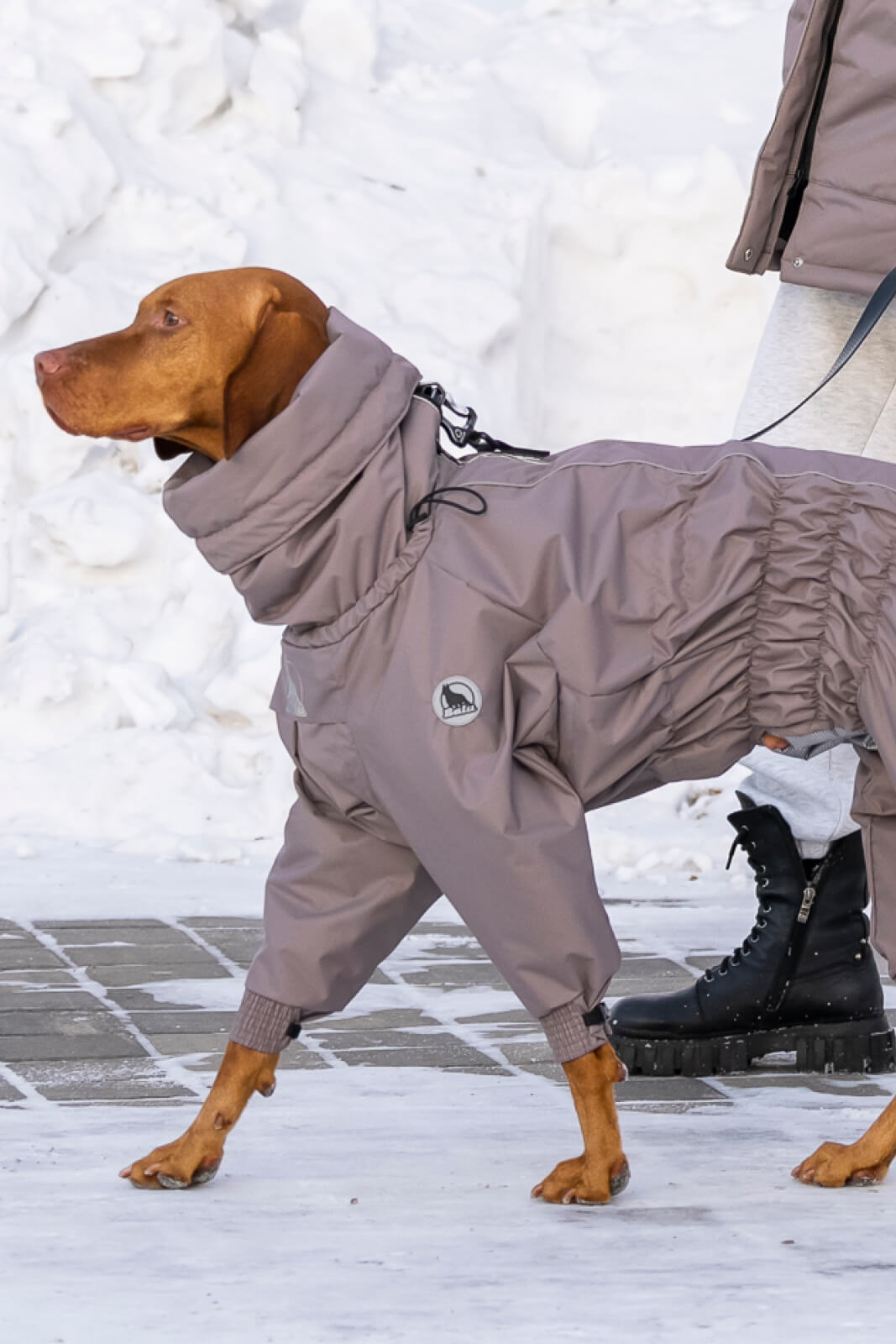 Фольгированный подклад, сохраняет тепло. Но в мороз гладкошерстной собаке, если идти шагом или стоять на остановке, становится прохладно.