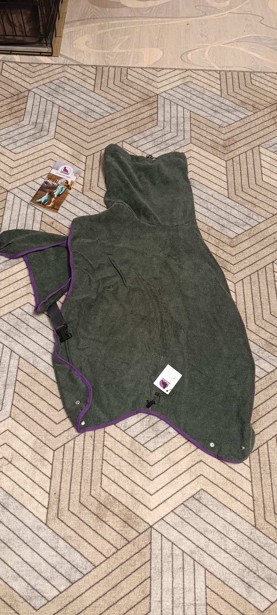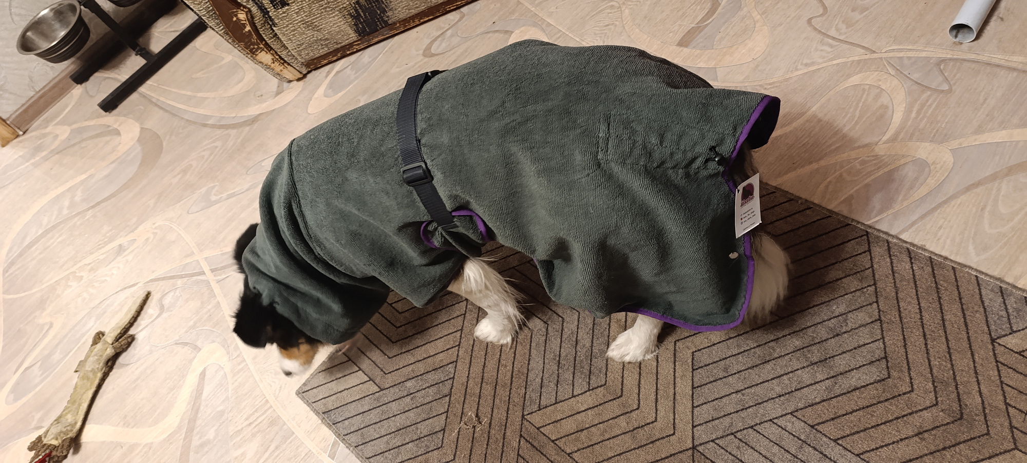 У меня собака с длинной шерстью и долго сохнет (не люблю очень мокрую собаку сушить феном). А тут очень удобно. Промакнул основное полотенцем, затем надел халат и ждёшь, когда собака просохнет. Не надо держать. Собака может спокойно перемещаться и заниматься своими делами, а я не беспокоюсь, что всё вокруг будет мокрым. Очень хорошо впитывает. Собака потом практически сухая.